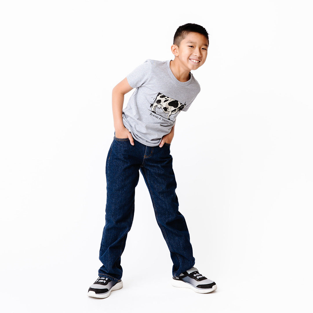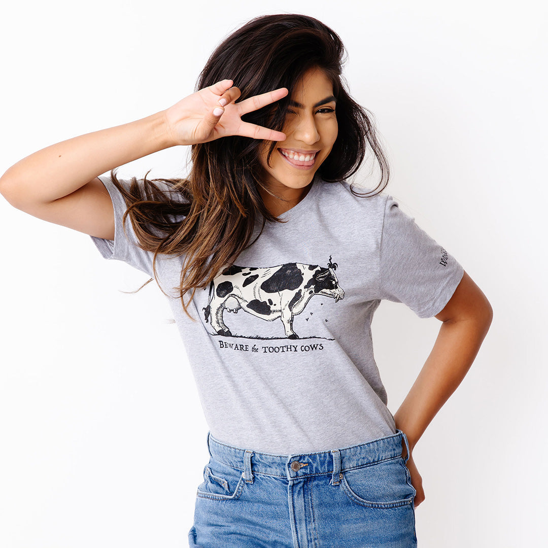 Beware of Toothy Cows and uncomfortable clothes! This new scoop neck t-shirt is made of thin, durable material that allows for all day comfort.