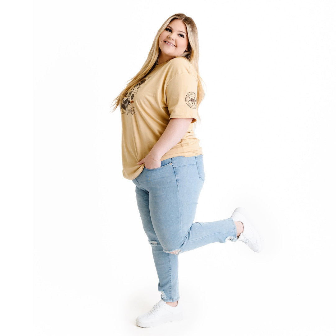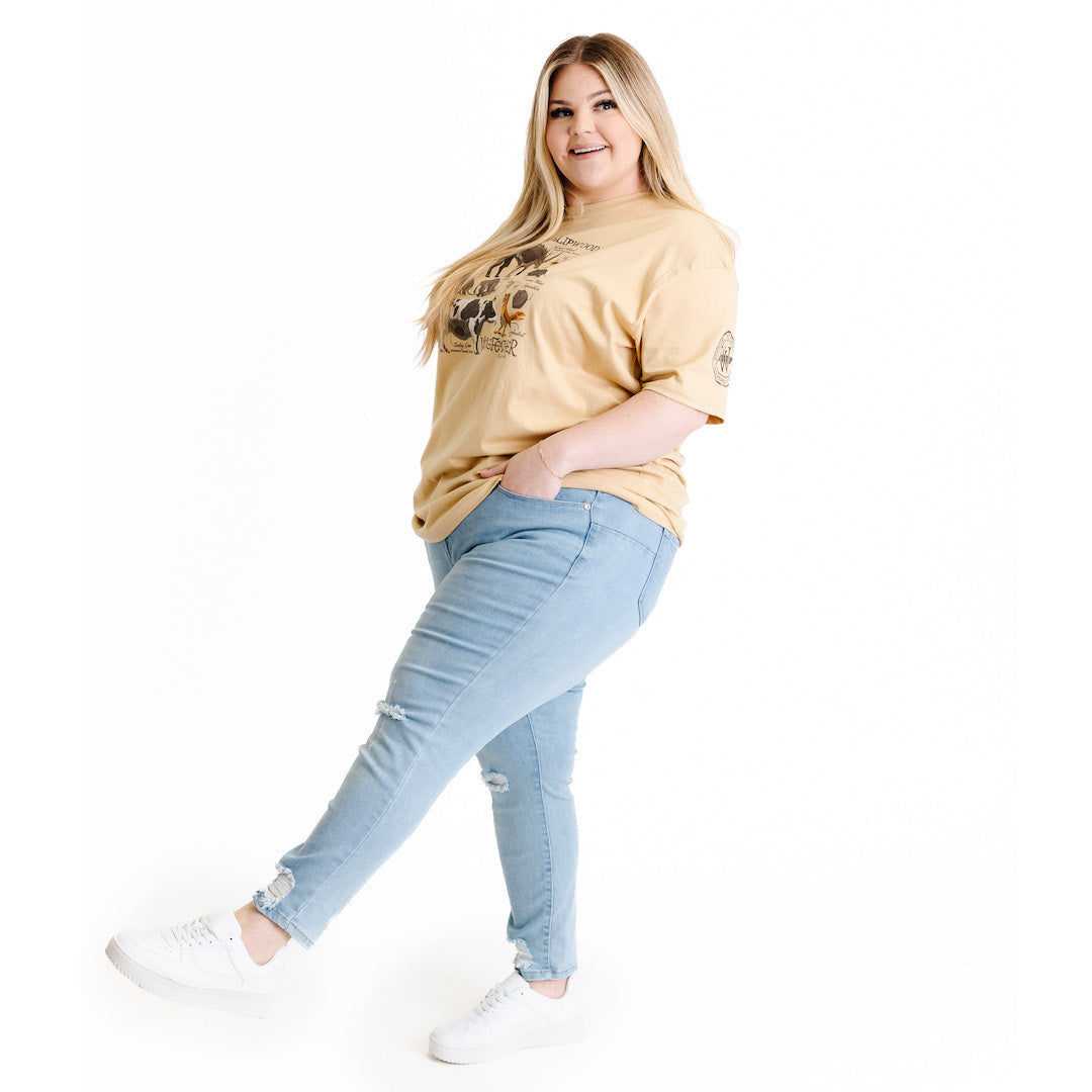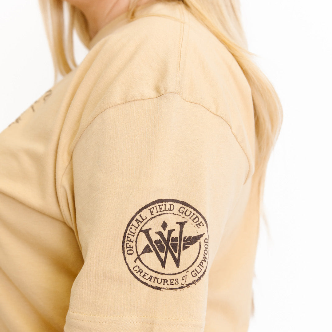 Beware of the Toothy Cow! The Creatures of Glipwood are not to be trifled with. The tan-colored T-shirt will help you overcome your fear of Skree's dangerous creatures.